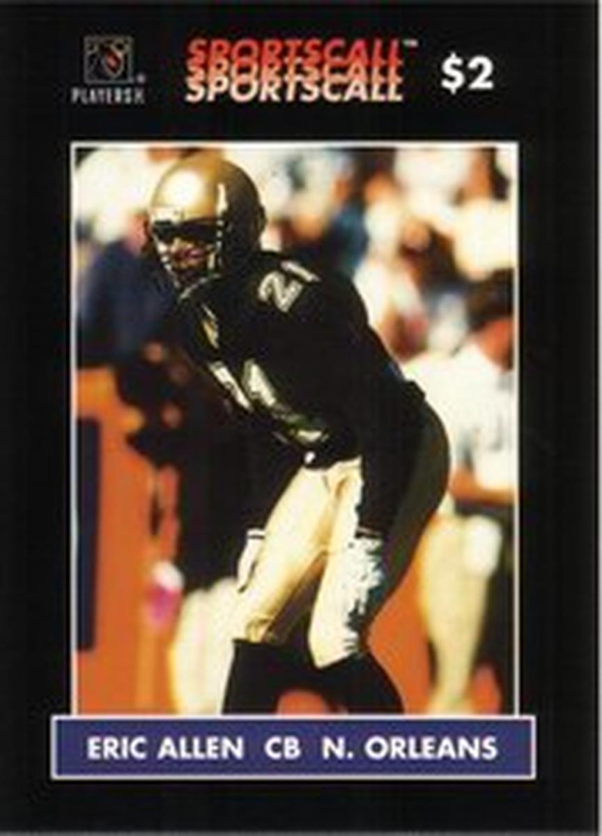 This card is printed on paper and is part of a set related to football, specifically focusing on NFL players. The imagery captures Eric Allen in an action-ready stance, emphasizing his athletic presence as a cornerback for the New Orleans Saints. The card’s design and text confirm its connection to professional football and the official NFL licensing through Players Inc.