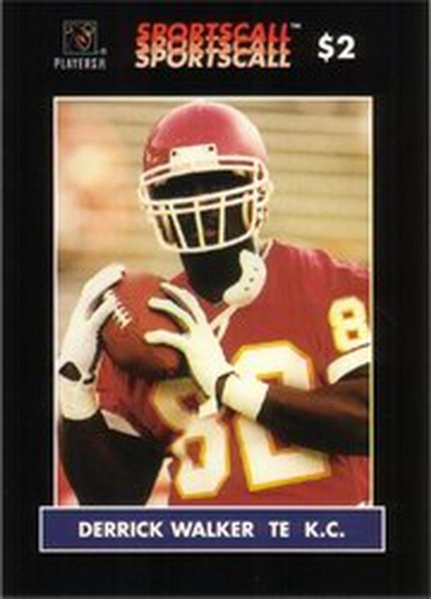 Derrick Walker is pictured in his football uniform, showing the Kansas City Chiefs team colors and helmet. The artwork focuses on the player, with his name, position abbreviation "TE," and the team affiliation clearly stated. The layout includes the SportsCall branding and related football imagery, emphasizing the NFL theme.