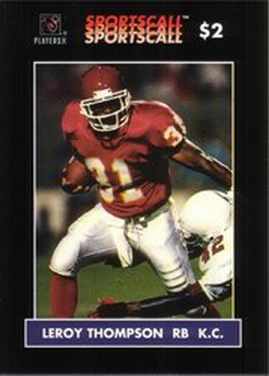 Overall, this card is a collectible football memorabilia item, directly tied to the NFL and the Kansas City Chiefs, celebrating Leroy Thompson as a player. It is printed on paper stock and carries authentic league and team branding, making it a valid piece for sports card collectors interested in NFL players and specifically those who follow the Kansas City Chiefs.