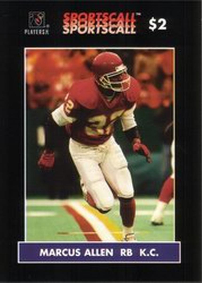 This card is printed on paper and is categorized within football sports collectibles. It highlights Marcus Allen’s role as a prominent NFL player and serves as a memorabilia item for fans and collectors interested in football and the Kansas City Chiefs franchise.
