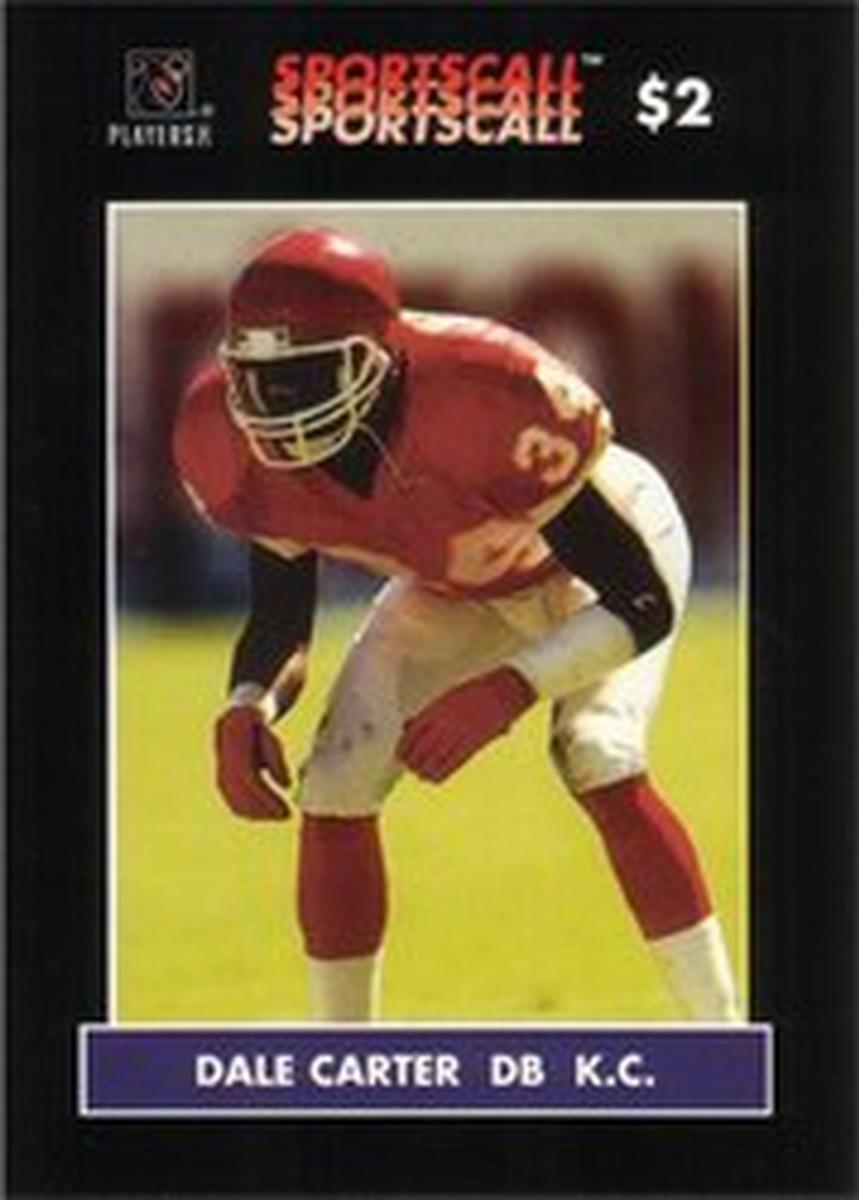 This SportsCall paper card is part of a football collectible series that focuses on NFL players, making it valuable for fans and collectors of professional football memorabilia. The card combines team colors, player imagery, and official league logos, representing a piece of NFL sports history involving the Kansas City Chiefs and their defensive back, Dale Carter.