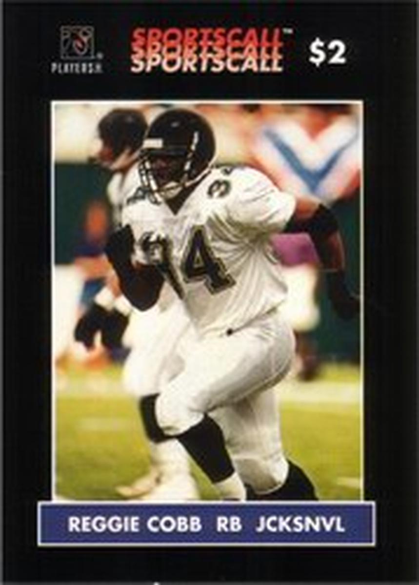 This card is a collectible piece for fans and collectors of NFL player cards, especially those focused on Reggie Cobb and the Jacksonville Jaguars. The inclusion of the SportsCall branding and paper material offers insight into the card’s format and origin within football card collections.