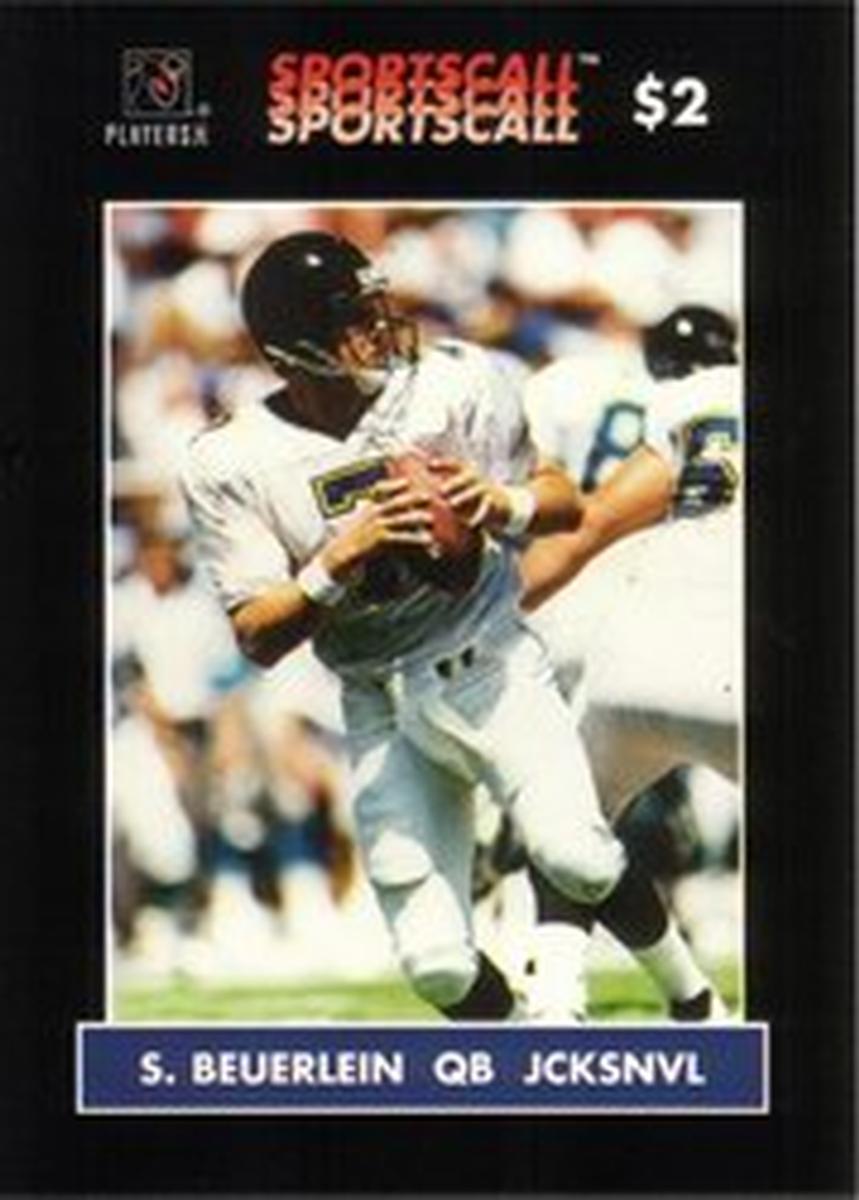 The card’s design balances the photographic player image with clear text labels, including the player’s name “Steve Beuerlein” prominently featured. It highlights the connection to professional football and the Jacksonville Jaguars team within the broader context of NFL collectibles.