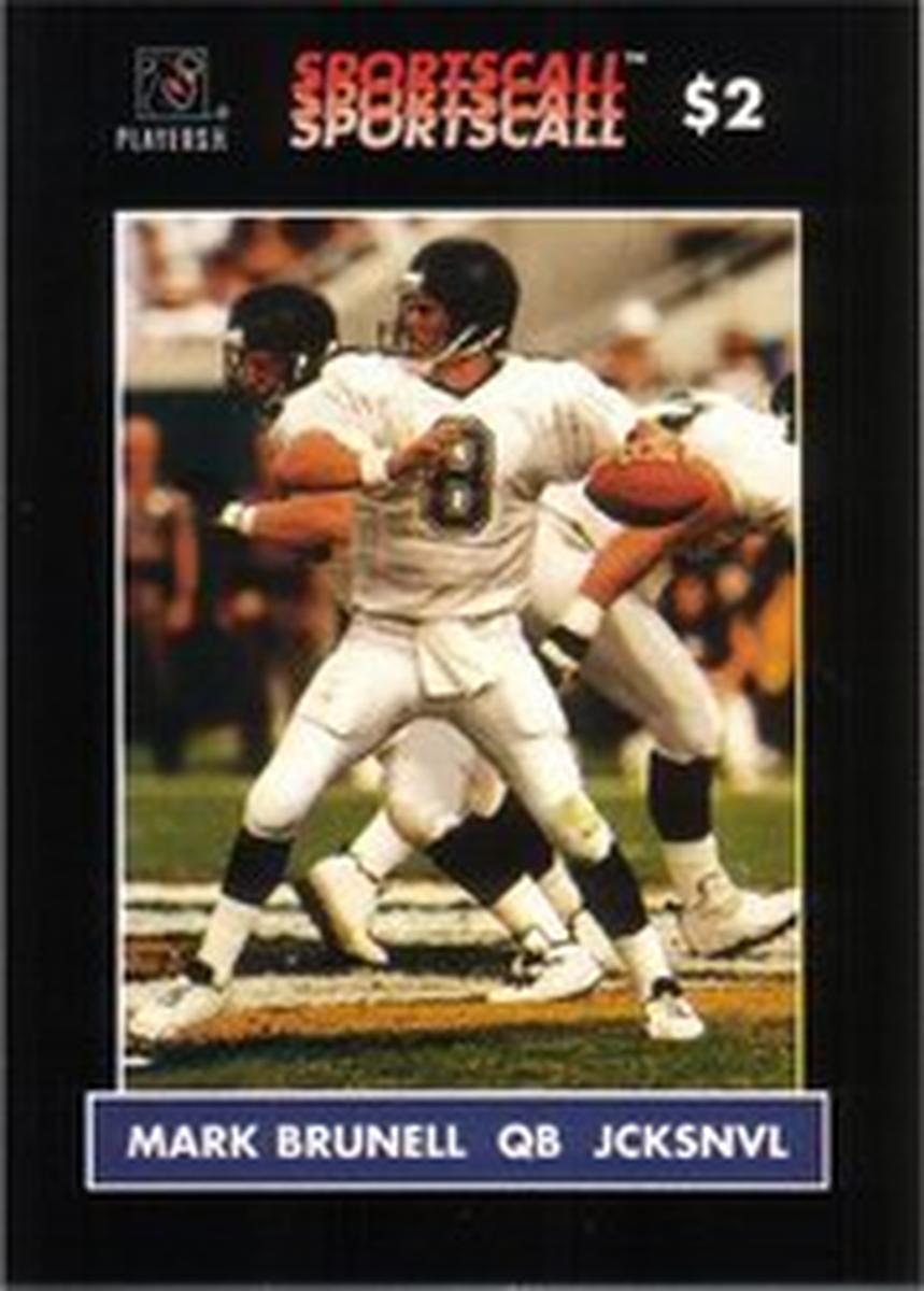 Overall, this card combines sports iconography with collectible card design, highlighting Mark Brunell’s role in professional football during his tenure with the Jacksonville Jaguars. The $2 value on the card represents its collectible or functional aspect within the SportsCall series.
