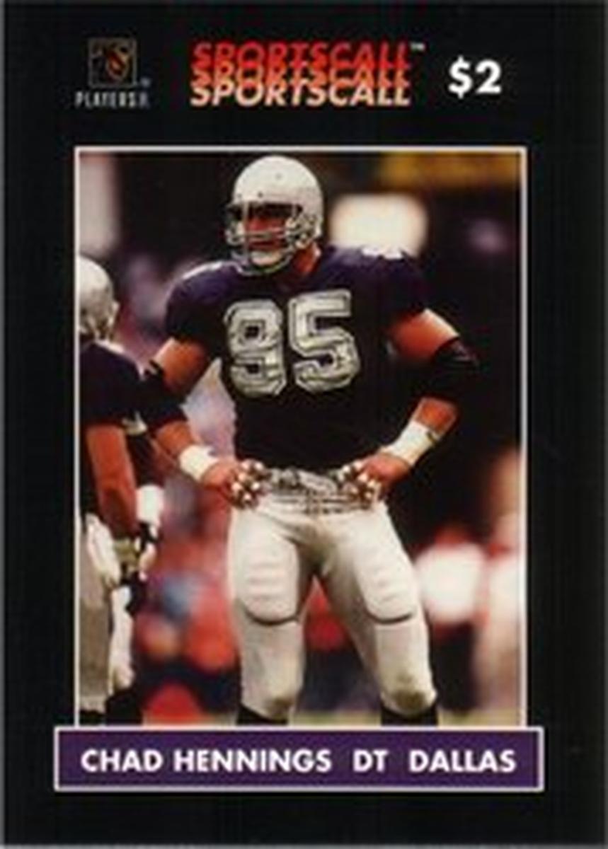 The front of the card displays a clear image of Chad Hennings in action, wearing the Dallas Cowboys uniform. The name "Chad Hennings" is printed on the card, along with his position and team information. The NFL, National Football League, and Players Inc. logos are also present, associating the card officially with the league and its players. The overall design aligns with sports memorabilia focused on professional football athletes.