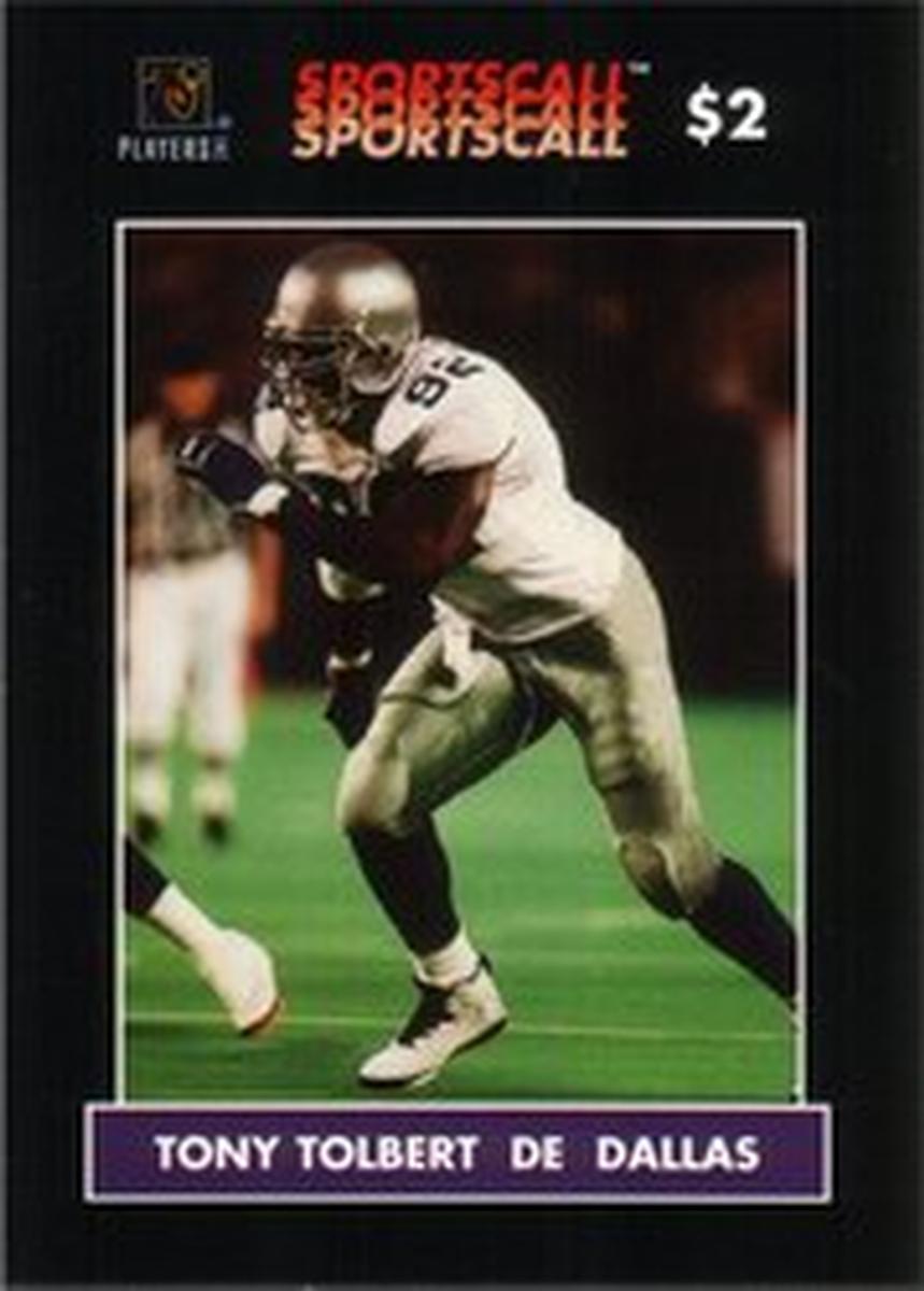 This piece is a collectible paper card connected to the sport of football, containing key textual information about Tony Tolbert and the Dallas Cowboys, along with NFL and SportsCall logos. It serves as a sports memorabilia item dedicated to a notable NFL player from the Dallas Cowboys franchise.