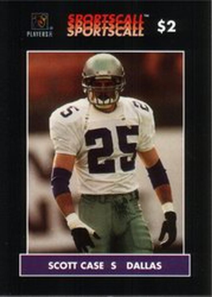 The card is labeled as #208 and is produced by SportsCall, a company known for creating collectible sports cards on paper. The design incorporates a greenish background with a blurred field or stadium image, emphasizing the football theme. The player’s name, Scott Case, and the team name, Dallas Cowboys, are prominently displayed on the lower section of the card.