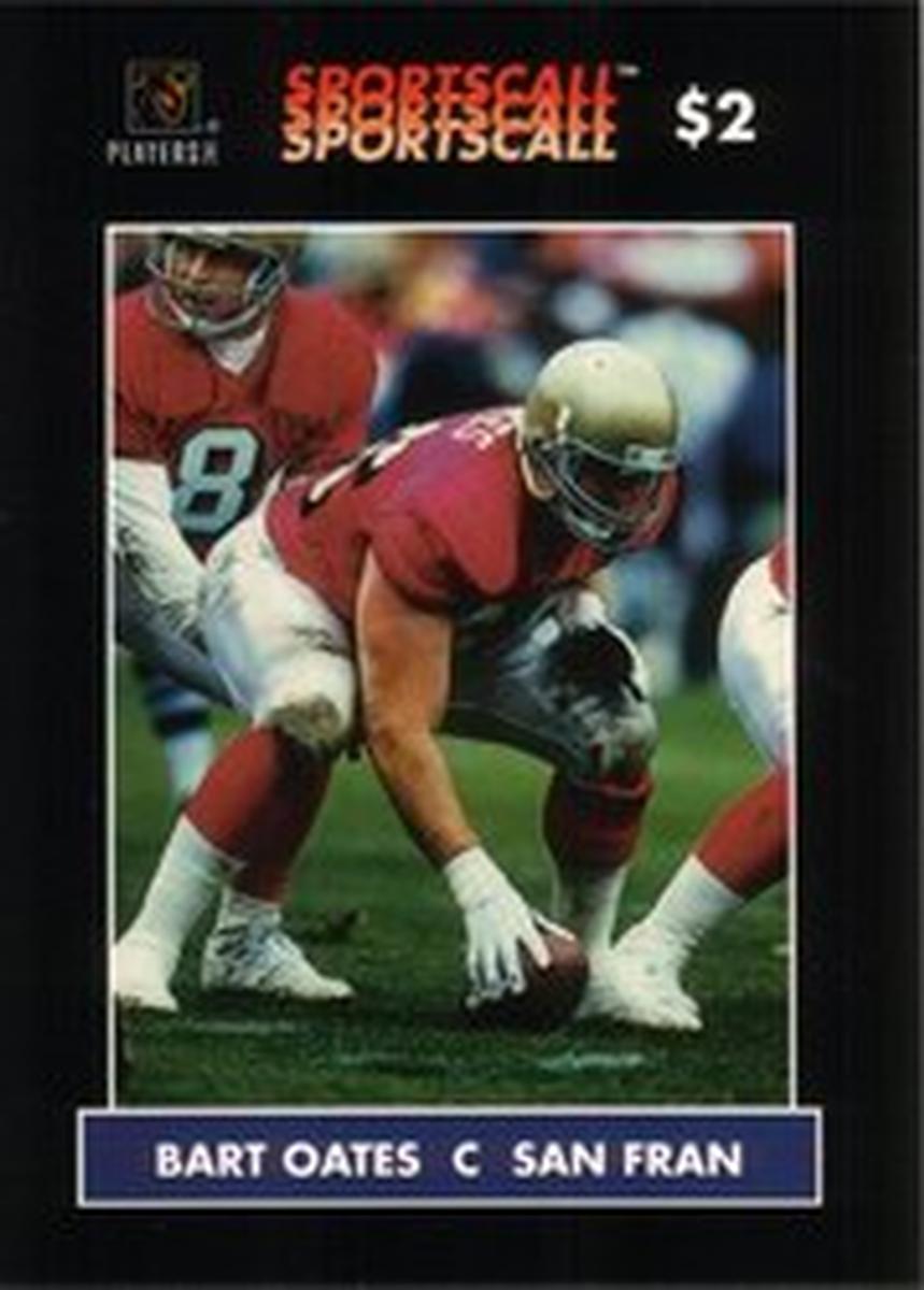 The front of the card includes several pieces of text: “Bart Oates (C San Francisco 49ers Football)” appears in the lower left corner along with the $2 value, indicating its denomination. The card’s branding also includes “Sports: Football, NFL, National Football League” to associate it directly with professional American football. Other written details are “SportsCall” and the card number “214,” positioned near the bottom edge.