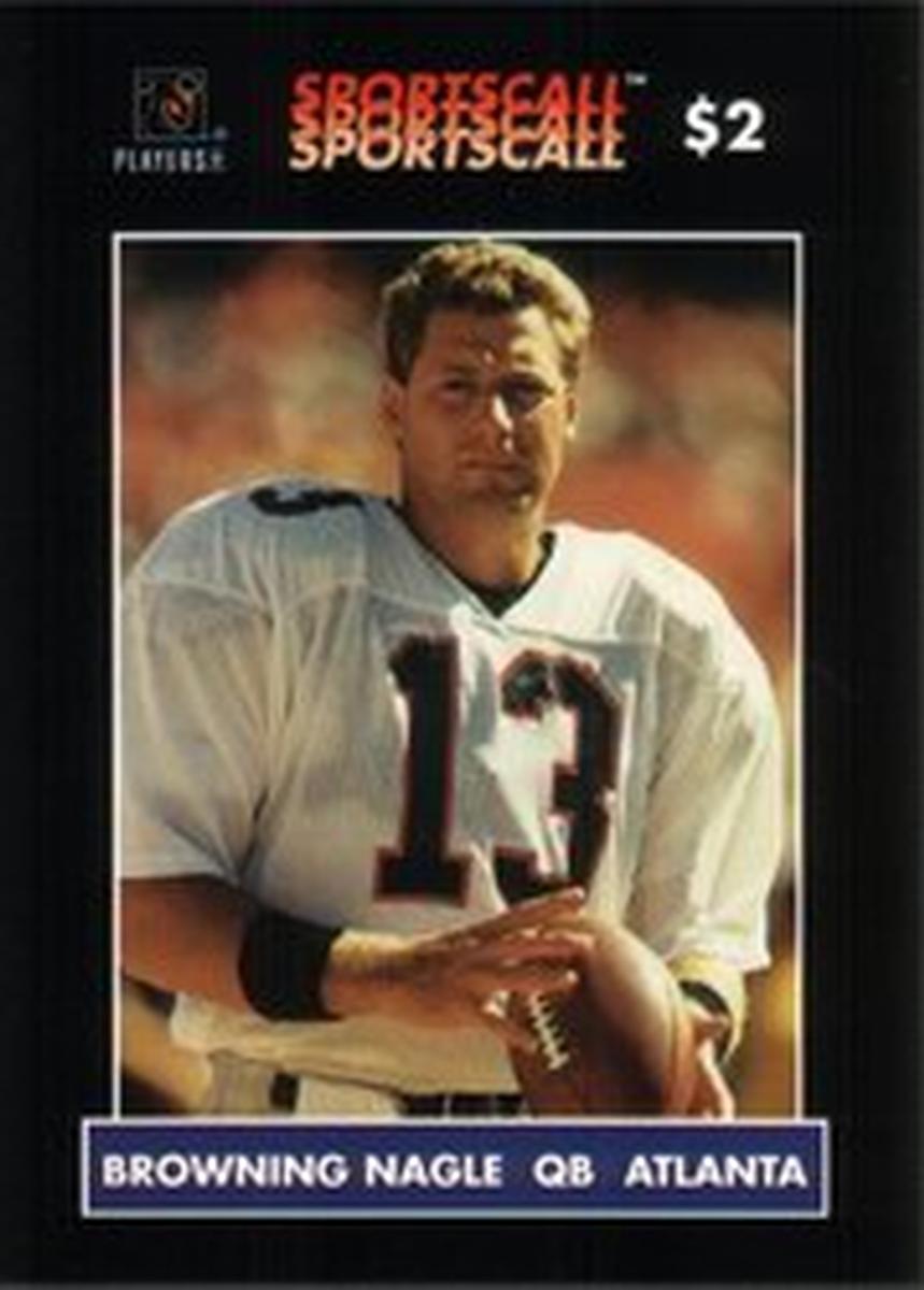 The background provides a clear view of the football field, adding context to Browning Nagle’s role as a quarterback. The overall presentation reflects its focus on NFL football and the Atlanta Falcons team during the period when Browning Nagle was an active player. The straightforward, professional layout is typical for sports trading cards derived from licensed NFL merchandise.