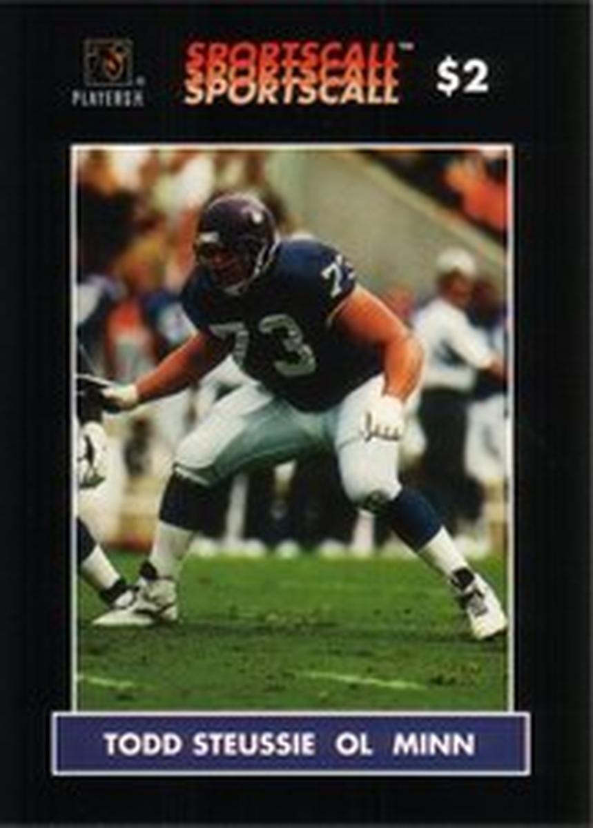 This collectible card features Todd Steussie, an offensive lineman for the Minnesota Vikings in the National Football League (NFL). The card is numbered 222 and belongs to the SportsCall series, printed on paper. Todd Steussie is shown wearing his Minnesota Vikings uniform, which includes the team’s purple and gold colors. The image highlights Steussie in a football action pose, emphasizing his role on the offensive line.