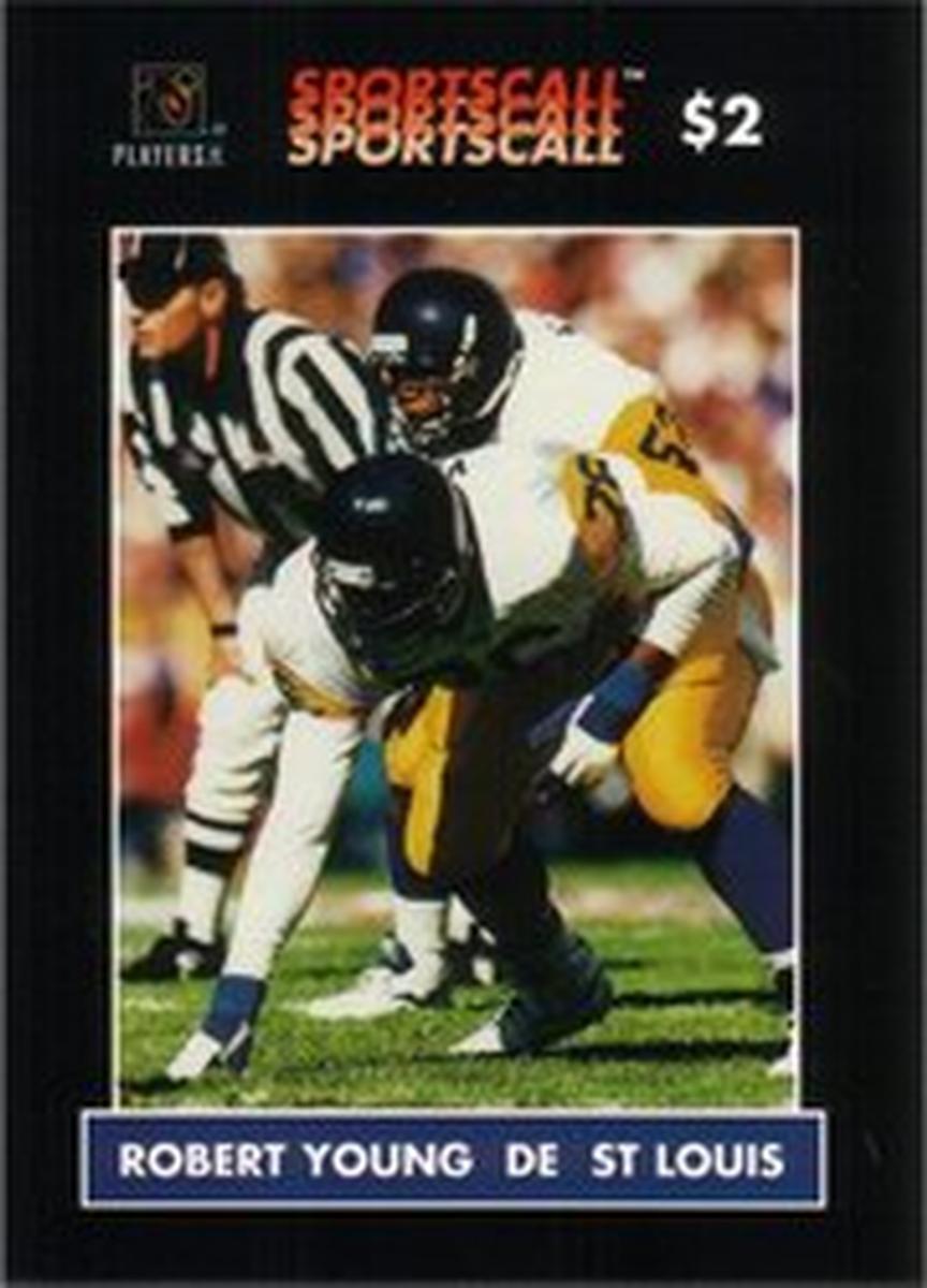 This collectible card features Robert Young, a defensive end for the St. Louis Rams football team. The card prominently displays the NFL and National Football League logos, affirming its connection to professional American football. The image captures Robert Young in action, positioned as he prepares for play, wearing the Rams' uniform with a helmet, shoulder pads, and jersey.