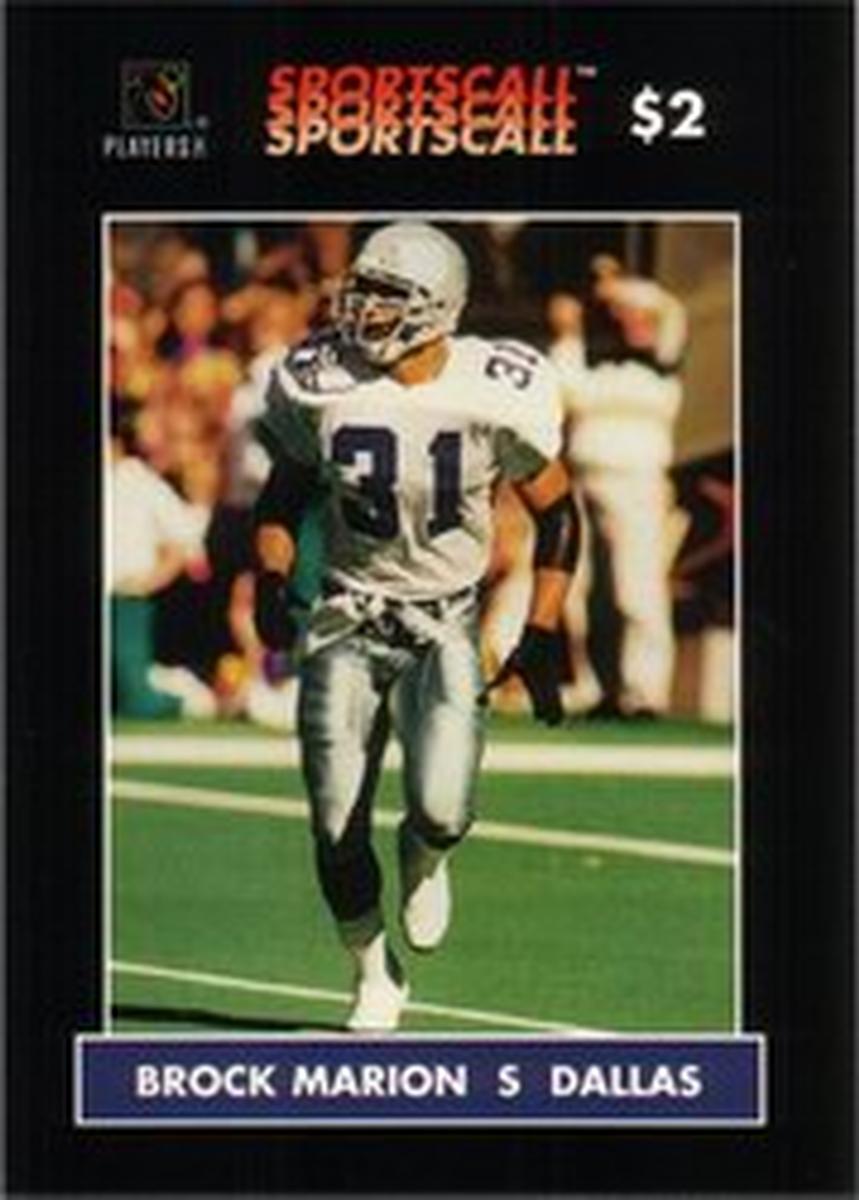 This collectible card features Brock Marion, a former professional football player known for his time with the Dallas Cowboys in the NFL (National Football League). Brock Marion is depicted wearing a Dallas Cowboys uniform, prominently displaying the team’s distinctive colors and star logo on the helmet. The card is numbered 225 and has the SportsCall branding, indicating its association with football and NFL collectibles.