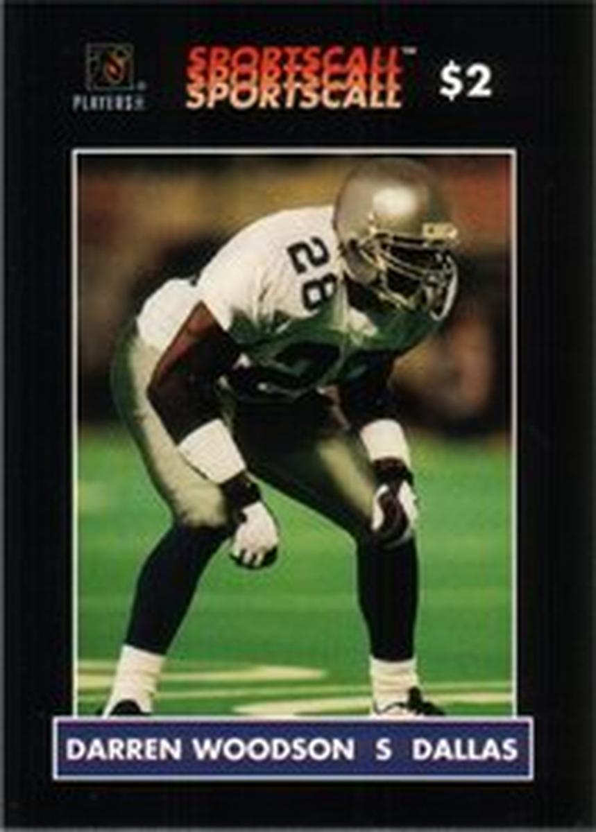 The card includes textual elements such as “Darren Woodson (S Dallas Cowboys Football)” and “Card #226” prominently displayed. The SportsCall logo is positioned on the card, indicating the issuer or series related to NFL players. The background is dark, helping the figure of Woodson and the text stand out clearly. The card emphasizes the sports and NFL connection, specifically focusing on a notable Dallas Cowboys player.