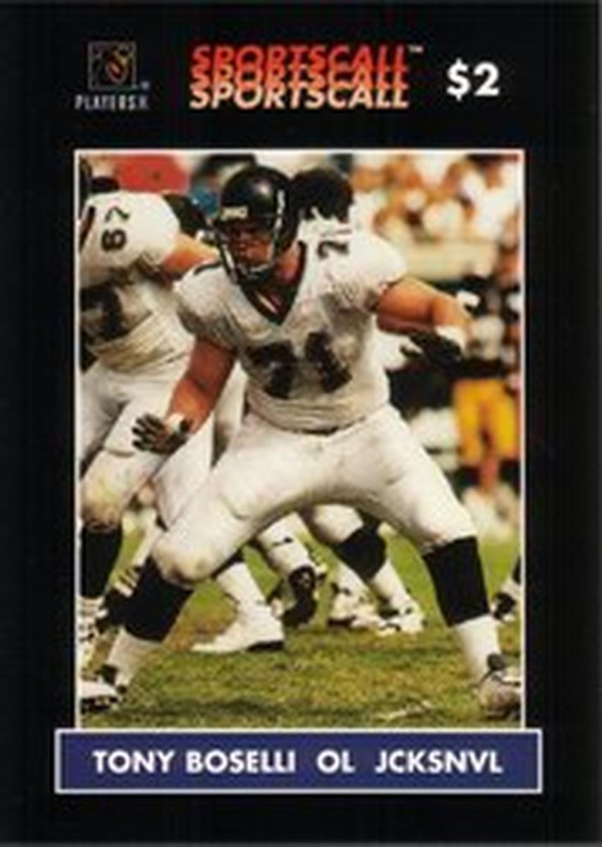 The card is numbered 227 and is produced by SportsCall, identified as a paper collectible. It highlights Boselli’s prominence as a professional NFL player, and includes the NFL branding alongside the Jaguars team logos and colors. The card’s design is straightforward and sports-focused, featuring bold text with Tony Boselli’s name and position, ensuring clarity for collectors and fans of NFL football memorabilia.