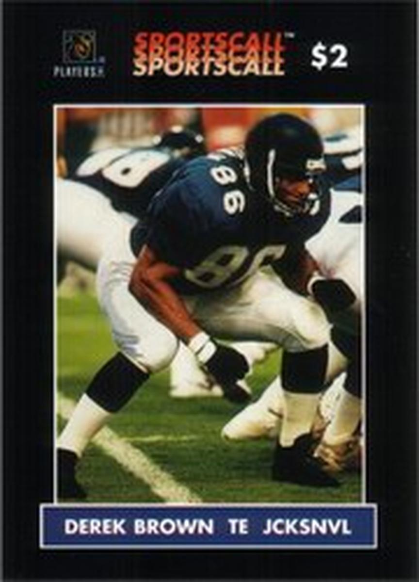 This collectible card features Derek Brown, a tight end for the Jacksonville Jaguars in the National Football League (NFL). The card shows a photographic image of Derek Brown wearing his Jaguars uniform, including the helmet and jersey. The Jacksonville Jaguars logo is visible on the helmet and shoulder area of the uniform. The card’s design incorporates the SportsCall and Players Inc. logos. The number 228 is displayed on the card, indicating its specific place in the series.