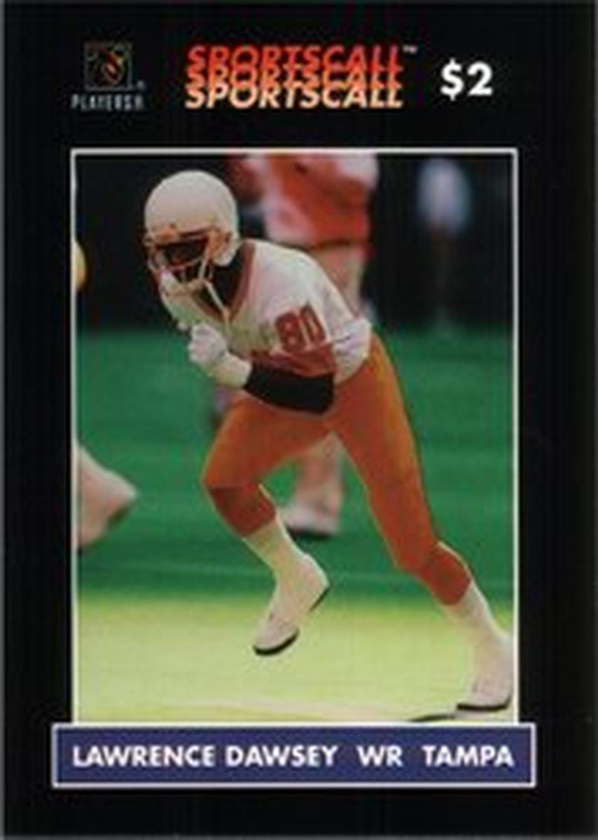 This collectible card features Lawrence Dawsey, wide receiver for the Tampa Bay Buccaneers in the National Football League (NFL). Dawsey is shown wearing the Buccaneers' uniform with the team colors and logo clearly visible. The card displays Dawsey in an action pose on the football field, emphasizing his role as a professional football player.