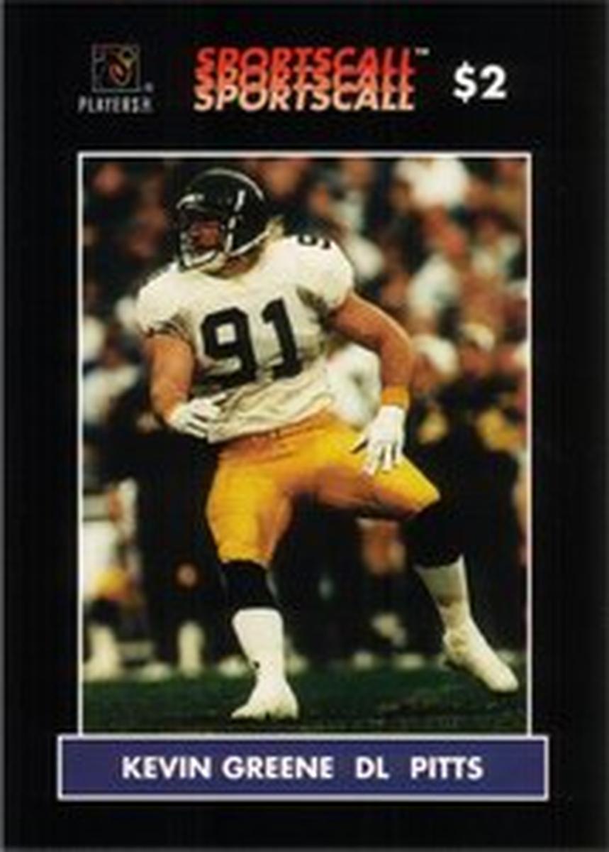 This collectible card features Kevin Greene, a former defensive lineman (DL) for the Pittsburgh Steelers in the National Football League (NFL). The card belongs to the SportsCall series and is made of paper. Kevin Greene is pictured in his Steelers uniform, ready for action. The design includes the NFL and National Football League logos, emphasizing the official sports licensing.