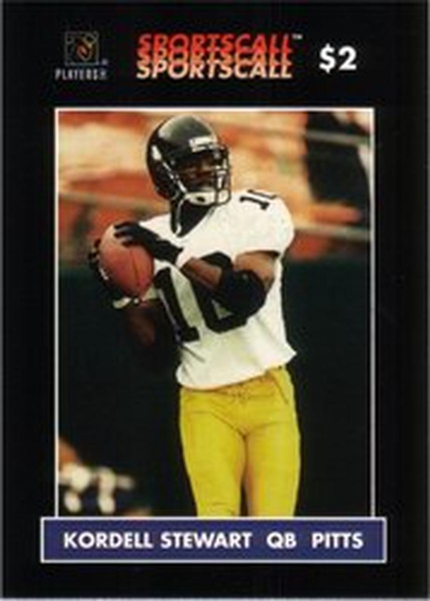 The card is part of the SportsCall series and has a $2 value indicated on the front. Kordell Stewart's name appears prominently near the lower portion of the card alongside his position abbreviation "QB" and the team name Pittsburgh Steelers. Additional printing on the card lists the National Football League and Players Inc., establishing its association with professional football collectibles.
