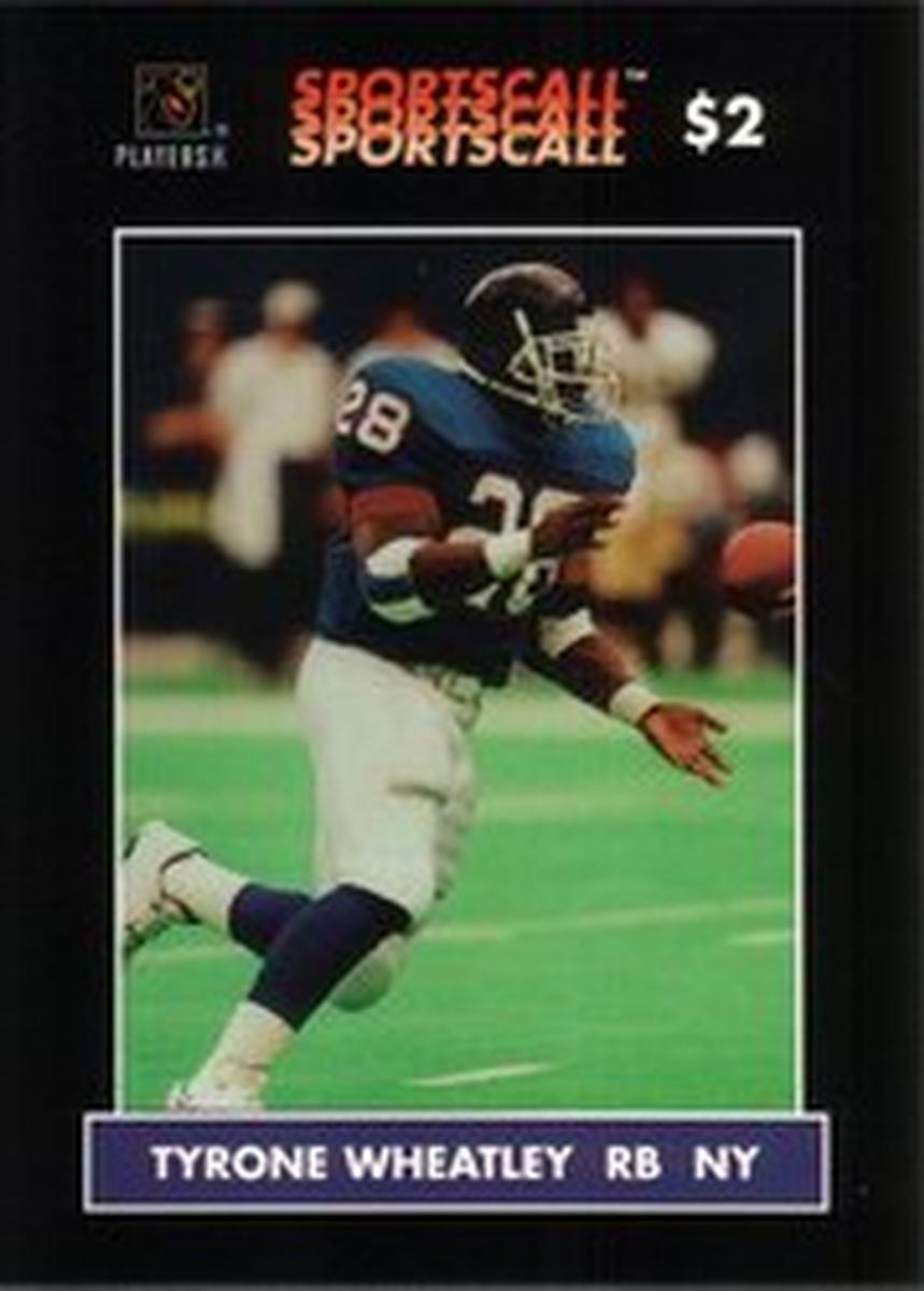 This piece serves as a sports collectible reflecting a significant moment in Tyrone Wheatley’s career with the New York Giants in the NFL. The card’s details and branding, including the NFL shield and SportsCall emblem, authenticate it as an officially licensed item for fans and collectors.