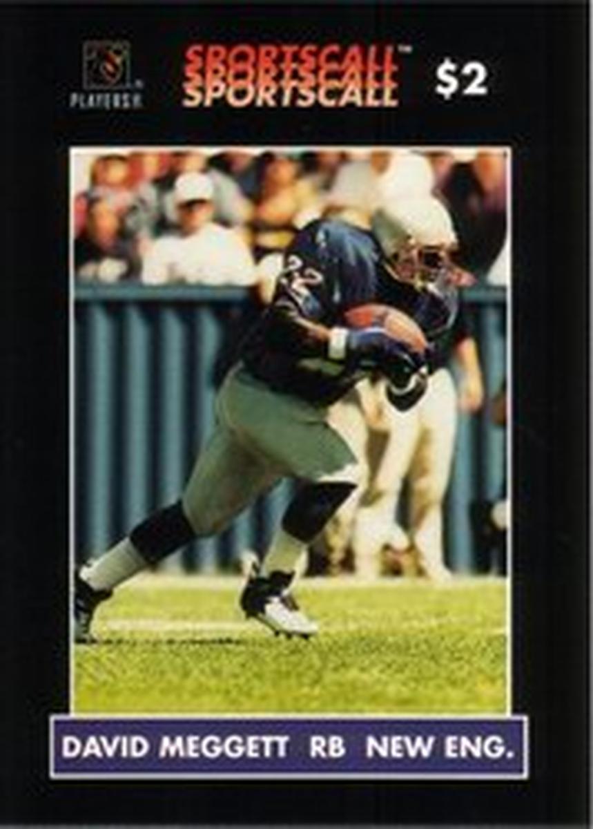 At the top, the name "David Meggett" and his position “RB” (running back) are clearly printed. The New England Patriots logo is visible alongside the player’s name, reinforcing the team affiliation. The words "players inc." appear on the card, which is a trademark associated with official NFL player products. The “SportsCall” logo is present on the card, indicating the manufacturer or series, printed on paper as this is a paper collectible card.