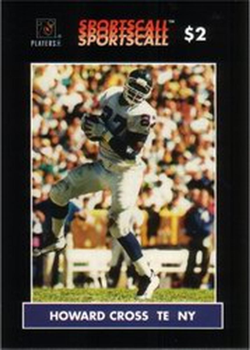 This collectible card features Howard Cross, a tight end for the New York Giants, an NFL team in the National Football League. The card shows a clear, full-color photographic image of Howard Cross wearing his New York Giants uniform. He is pictured in action, holding a football and poised as if preparing to make a play. The image captures the intensity and focus of the player during a game scenario.