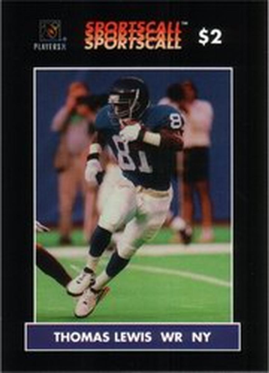 Printed text on the card identifies Thomas Lewis clearly, including his position as wide receiver (WR) and association with the New York Giants. The card number is 258, and the card is issued by SportsCall. The layout includes the official NFL and National Football League logos, along with other textual elements highlighting that this is an NFL collectible. The card is made of paper and designed in a vertical format, with colors and design elements consistent with football trading cards.