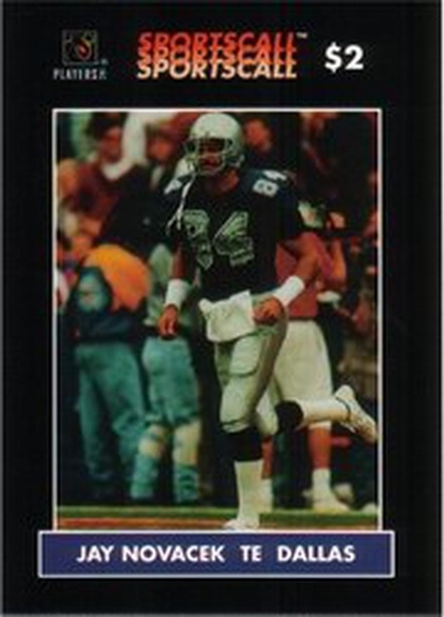 The card is issued by SportsCall and is printed on paper. It prominently displays "$2" indicating its value. The front of the card includes text that states "Jay Novacek (TE Dallas Cowboys Football)" along with mention of the National Football League and Players Inc. The NFL logo and the Players Inc. logo appear on the card, reinforcing its official connection to professional football.