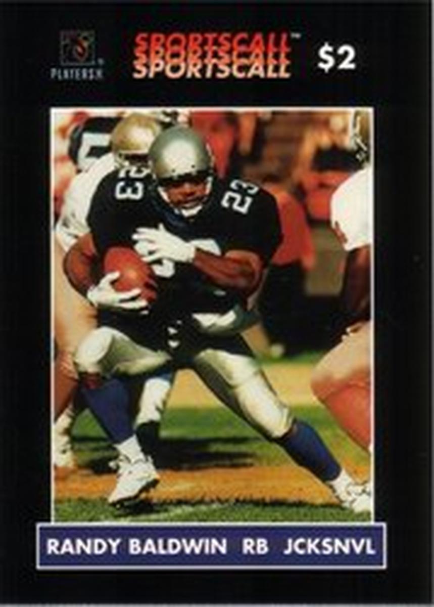 The design of the card has a sports theme, highlighting NFL football. Graphics include action-oriented imagery with Randy Baldwin in uniform, emphasizing his role as a professional football player. The branding "SportsCall" is present, indicating the card’s association with this particular line or series that focuses on sports figures and collectible memorabilia.