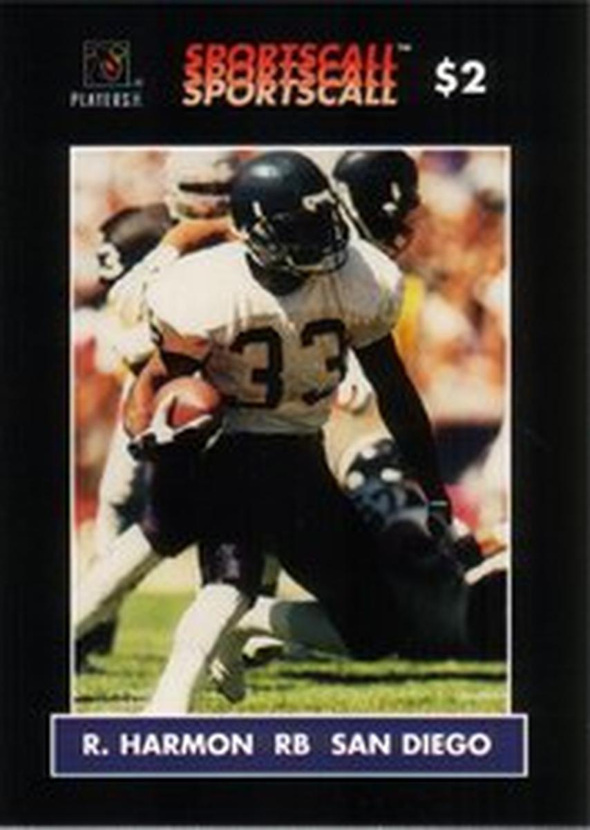The card is part of a SportsCall series printed on paper, highlighting American football. The design includes the NFL shield logo alongside the text "National Football League." The San Diego Chargers uniform details include blue and white colors with gold accents. Ronnie Harmon’s name and position (RB) are clearly printed on the front.