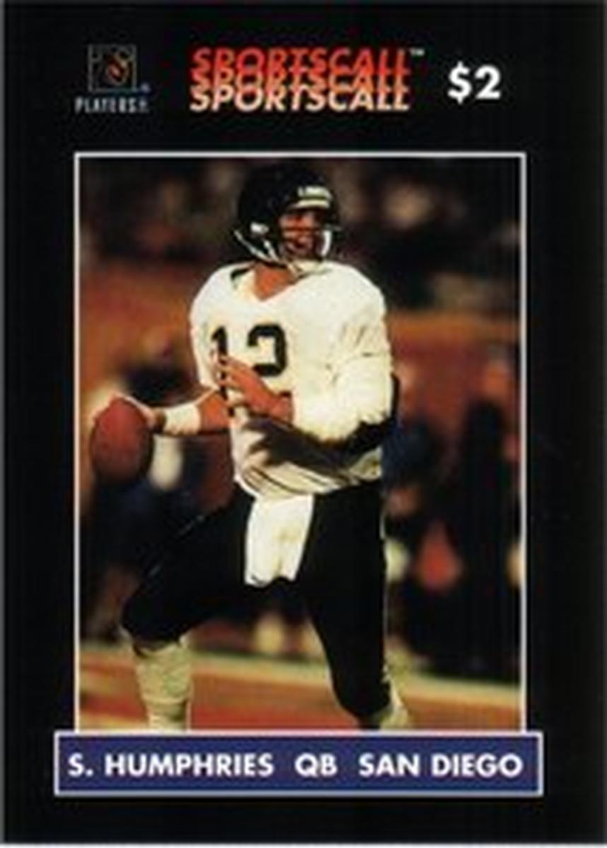 This collectible card appeals to football fans and card collectors interested in NFL players, especially those focused on the San Diego Chargers and notable quarterbacks like Stan Humphries. The paper card format and branding from SportsCall add to its collectible value within the sports memorabilia field.