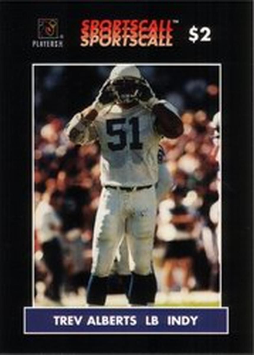 This collectible card features Trev Alberts, linebacker for the Indianapolis Colts football team in the National Football League (NFL). Trev Alberts is pictured prominently in football gear, including a blue Indianapolis Colts helmet and uniform. The card highlights Alberts in action or posed, emphasizing his role as a linebacker (LB) for the Colts.