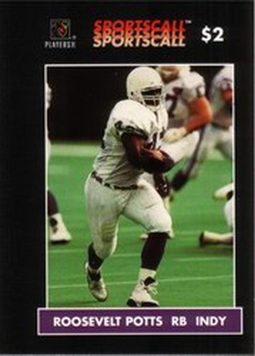 The upper right area of the card shows the text "Roosevelt Potts" in bold, white capital letters, followed by "(RB) INDIANAPOLIS COLTS FOOTBALL." Below the name is the number "270" in white. The top left corner features the National Football League emblem in a shield shape, displaying the NFL abbreviation with stars and stripes. Near the center right, the card has the word "SportsCall" displayed vertically in a stylized silver font on a blue background.