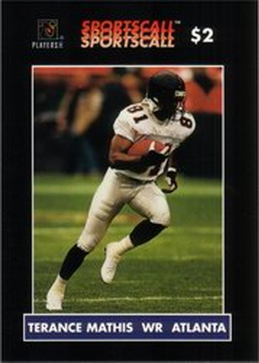 Overall, this card commemorates Terance Mathis’s role as a wide receiver for the Atlanta Falcons, offering a collectible moment connected to his professional football career with official league and team emblems.