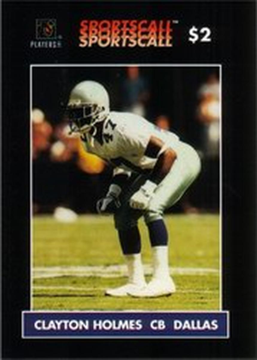 The card includes the SportsCall branding, emphasizing its association with NFL players and football memorabilia. Text on the card identifies Clayton Holmes by name and position (CB), reinforcing the card’s focus on professional football and the Dallas Cowboys. The background of the card has a gradient design, likely enhancing the visual emphasis on the player image and textual elements.
