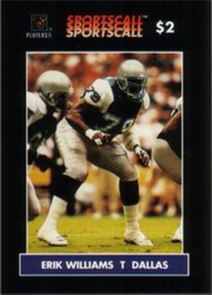 Overall, this card combines the vivid action photo of Erik Williams with official NFL and Dallas Cowboys insignias, making it a distinctive collectible item for fans of both the player and the sport. The card’s layout and design emphasize the athlete’s professional identity within the league and his role on the Cowboys’ roster.