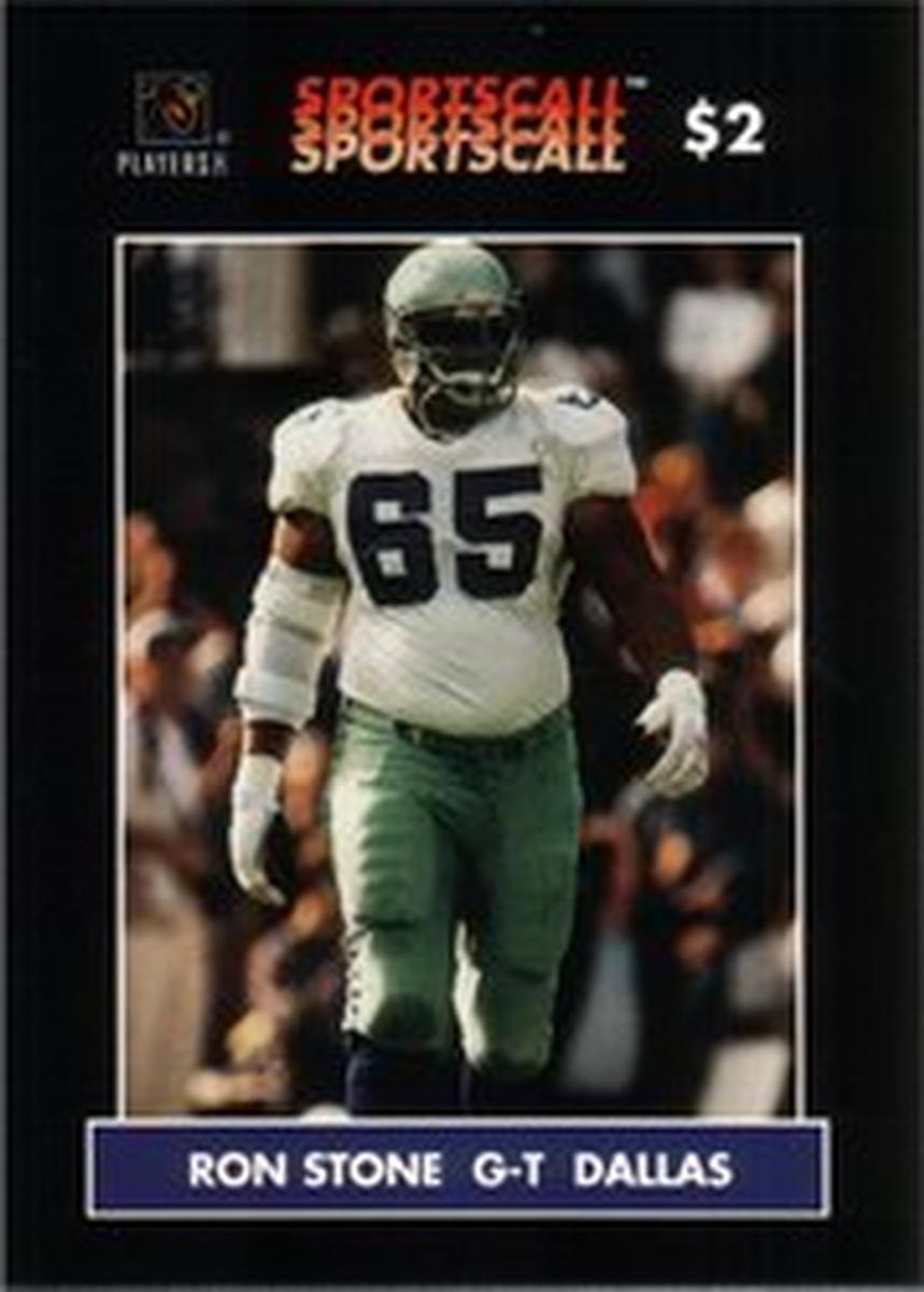 This collectible card features Ron Stone, a player for the Dallas Cowboys in the National Football League (NFL). The card is numbered 289 and is issued by SportsCall. The design prominently displays Ron Stone wearing a Dallas Cowboys football uniform, showcasing the team's signature star logo on the helmet and the recognizable blue and white team colors. The image captures Stone in a football stance or moment on the field, emphasizing his role as a guard or tackle (G-T) on the team.