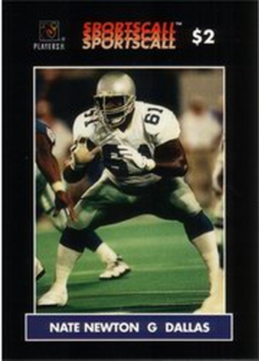 This card is made of paper and belongs to the SportsCall collection, identifiable by the wording seen on the front. The high-quality print and imagery highlight Nate Newton in action or posed to represent his career in professional football. The card’s visual and textual elements focus solely on his NFL persona with the Dallas Cowboys.