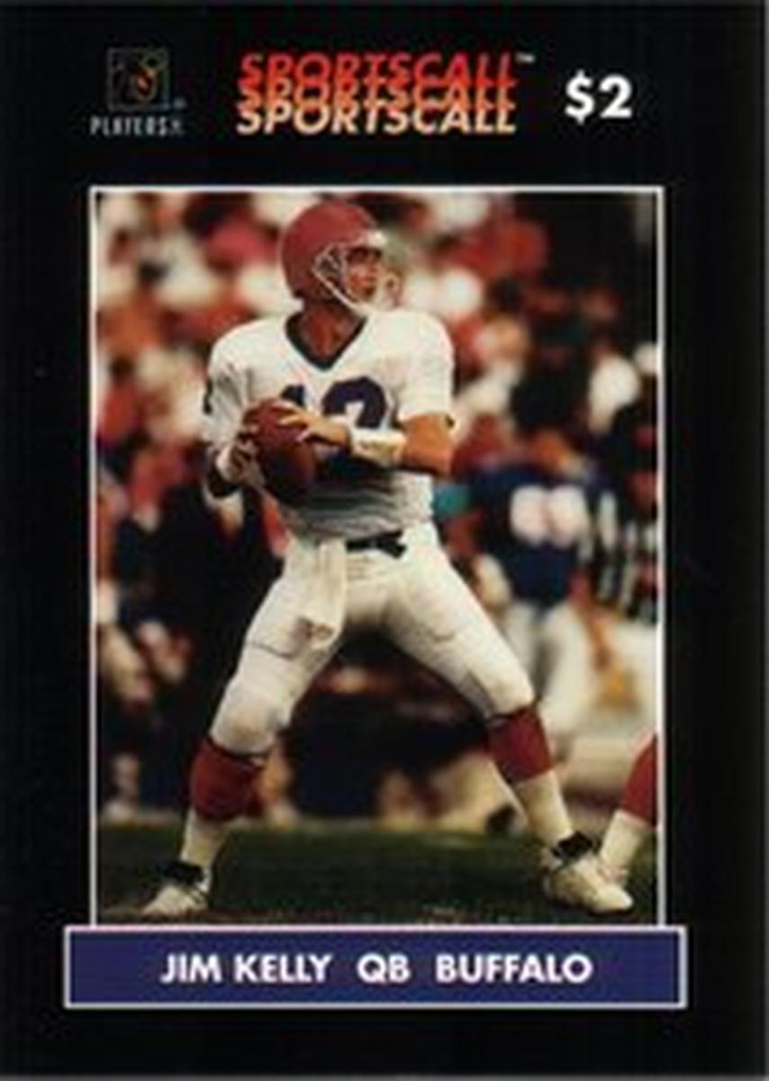 The card is labeled with the $2 denomination and includes the SportsCall branding, printed on paper. It highlights Jim Kelly’s position (QB) and team name (Buffalo Bills Football), along with the official NFL and National Football League logos. The overall design uses a clean layout that emphasizes the player image, team identification, and card value.