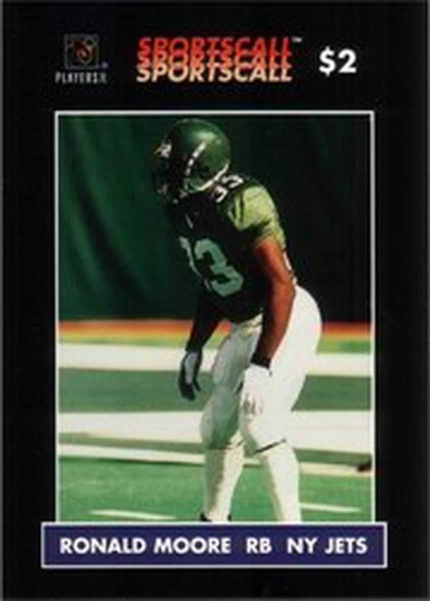 The overall presentation focuses on the player and team, with clear imagery and textual information to highlight Ronald Moore’s role in professional football. This item serves as a sports memorabilia collectible connected to the NFL and the New York Jets.