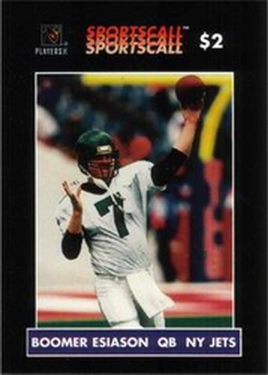 This item is identified as a Sports collectible card specifically focused on American football. It prominently features Boomer Esiason in his professional capacity with the New York Jets and is clearly marked with the card number, the NFL branding, and the SportsCall name.