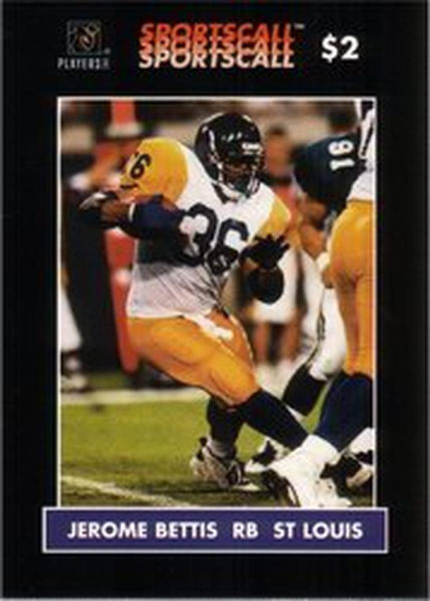 The front of the card prominently displays the name "Jerome Bettis" along with his position abbreviation "RB" and the team name "St. Louis Rams Football." The card background has a football-themed design, incorporating dynamic elements that emphasize the sport. This card belongs to a series focusing on football players from the NFL, highlighting key athletes and their professional roles.