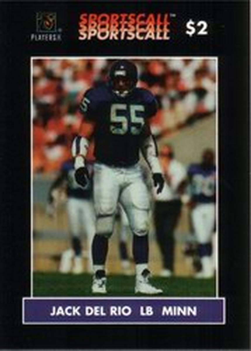 This collectible card features Jack Del Rio, a linebacker for the Minnesota Vikings, depicted in full football uniform. The card is numbered #312 and is issued by SportsCall on paper. Jack Del Rio’s name and position (LB) are clearly printed, along with the team name, Minnesota Vikings, indicating his role in the National Football League (NFL).