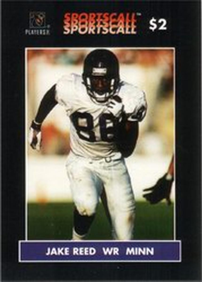 The design includes the Minnesota Vikings team name and colors prominently displayed, with “WR” (wide receiver) indicated next to Jake Reed’s name. The card incorporates typical football imagery and branding elements, such as the NFL shield and the SportsCall logo in the upper left corner. The text "$2" is printed on the card, reflecting its collectible series value.