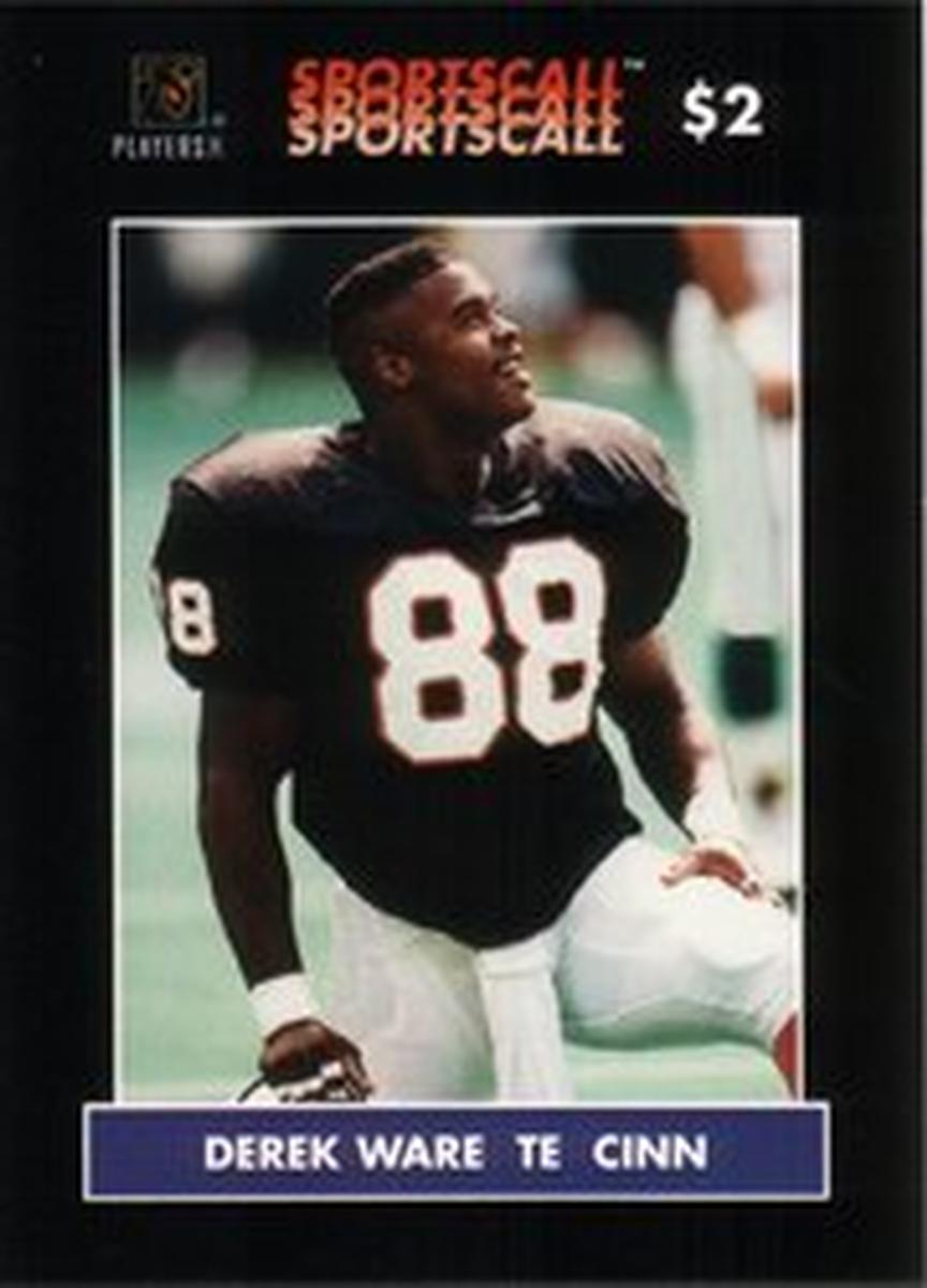 There are no additional graphics, images, or text aside from the player’s information, team affiliation, card number, league references, and manufacturer details shown on the front. The card’s appearance focuses strictly on Derek Ware as a football player for the Cincinnati Bengals and his status within the NFL ecosystem.
