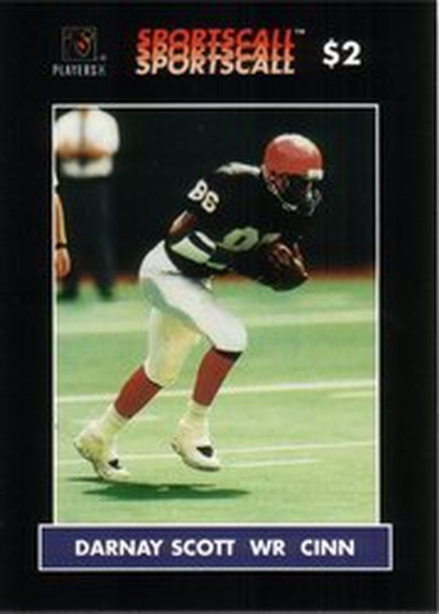 This collectible card features Darnay Scott, wide receiver for the Cincinnati Bengals, a team in the National Football League (NFL). Darnay Scott’s image is centered on the card, shown wearing the Bengals' uniform with the distinctive orange, black, and white color scheme. The player is holding a football, captured in an action stance possibly preparing to catch or run with the ball. The uniform includes the Bengals helmet, which features the team’s well-known tiger stripe design.