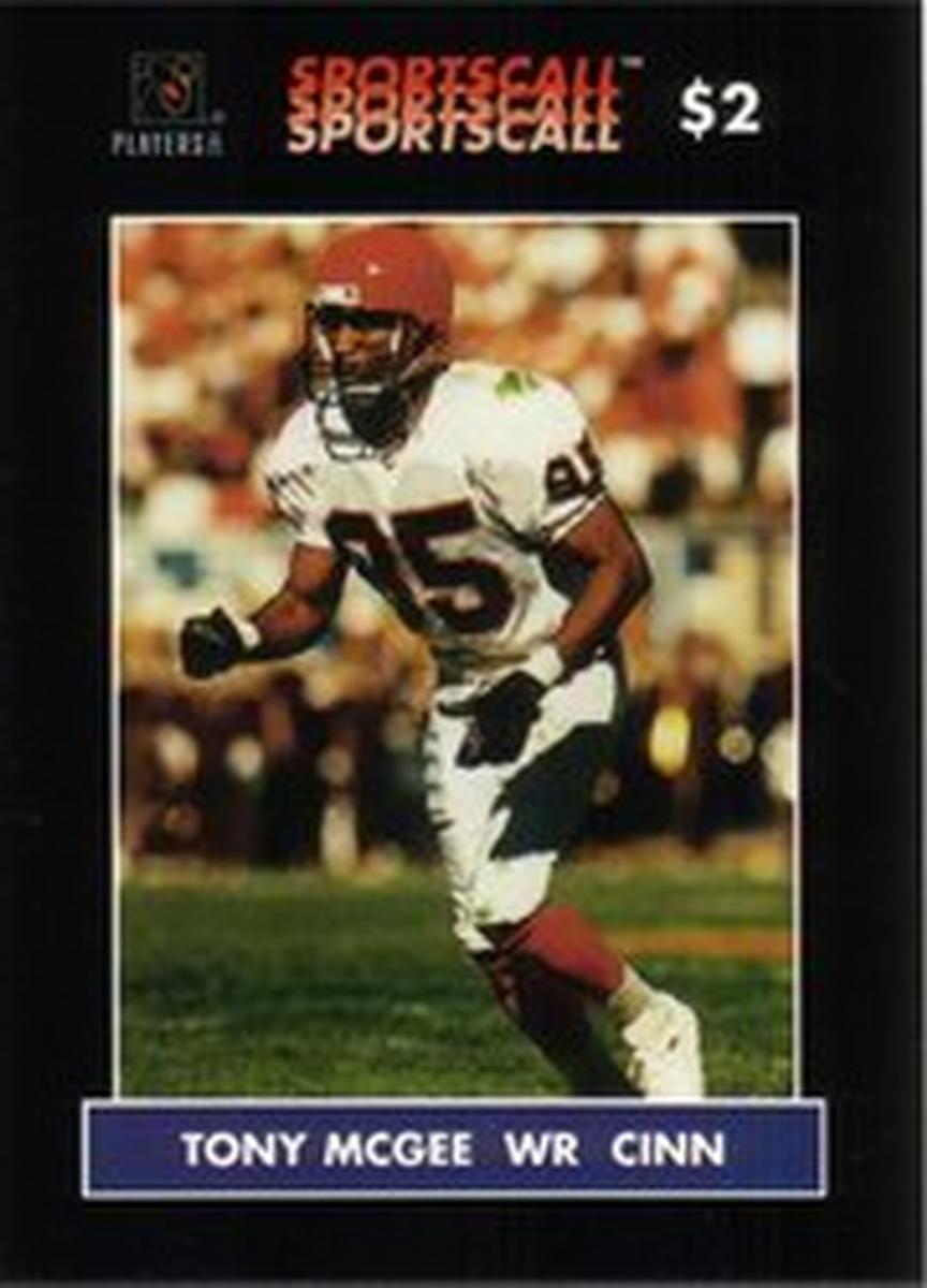 Tony McGee is depicted wearing a white helmet with the Bengals’ classic stripe pattern, and the image captures him in action or a posed football stance. The card includes clear identification of the player’s position as wide receiver (WR) and the team he represents. The SportsCall branding is also visible, marking the card as part of their series focused on NFL players.