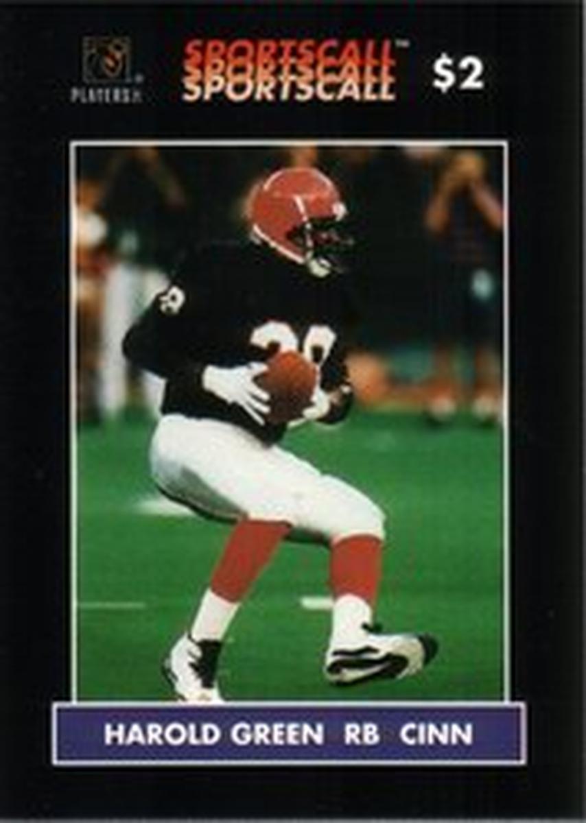 This card is a collectible sports item specifically focused on Harold Green’s football career with the Cincinnati Bengals. It provides a vivid portrayal of the player in action or posed for the trading card market and serves as memorabilia for NFL or Bengals fans.