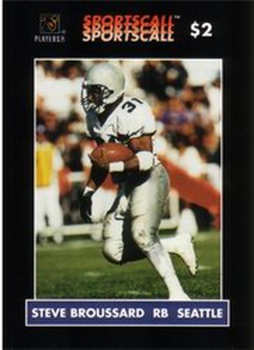 The background of the card is simple, emphasizing the image of Steve Broussard. The design incorporates branding for SportsCall, and the card’s layout is consistent with collectible sports phone cards that highlight prominent NFL players. The card’s denomination and player name are clearly printed on the front.