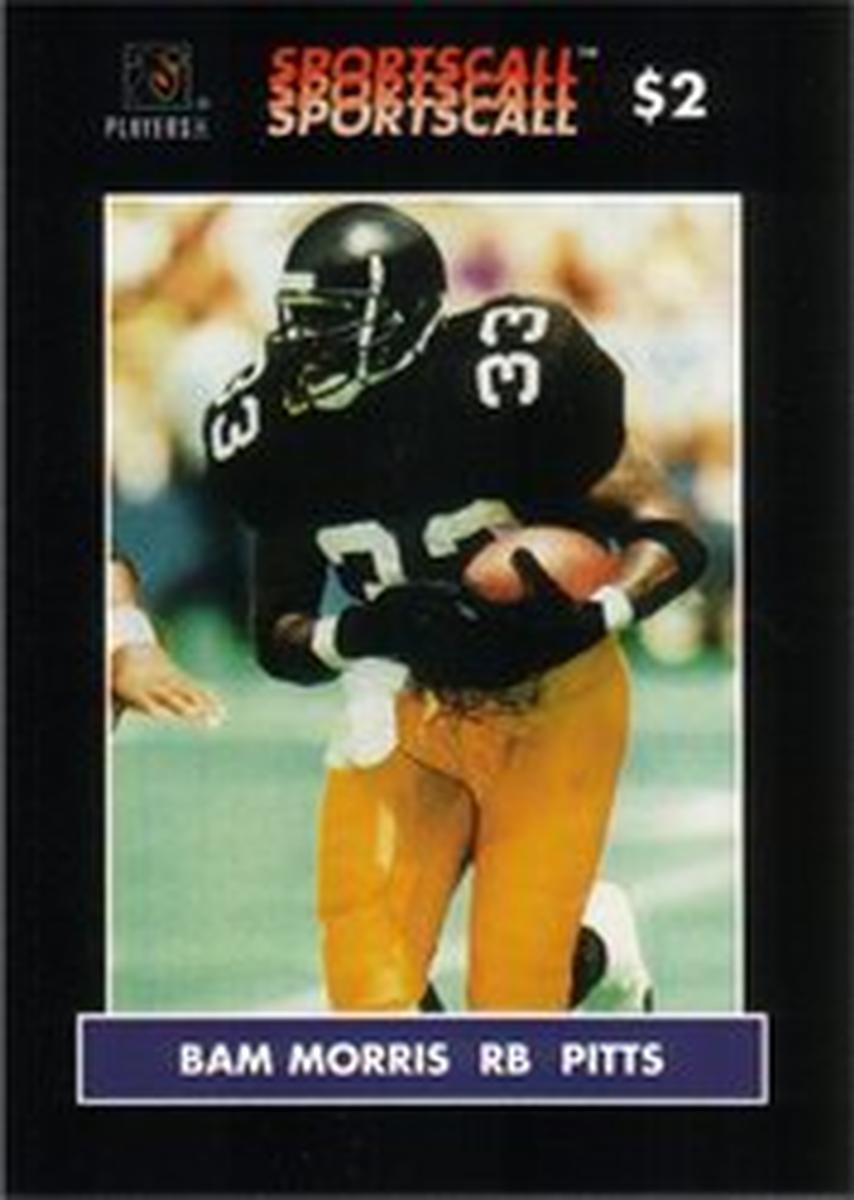 This collectible paper card features Bam Morris, a former professional running back for the Pittsburgh Steelers in the National Football League (NFL). The card prominently displays a photograph of Bam Morris in his Steelers uniform, wearing the number 33. The uniform is predominantly black with white and yellow accents, consistent with the Pittsburgh Steelers team colors. The image captures Morris in action during a football game, holding the football securely as he runs.