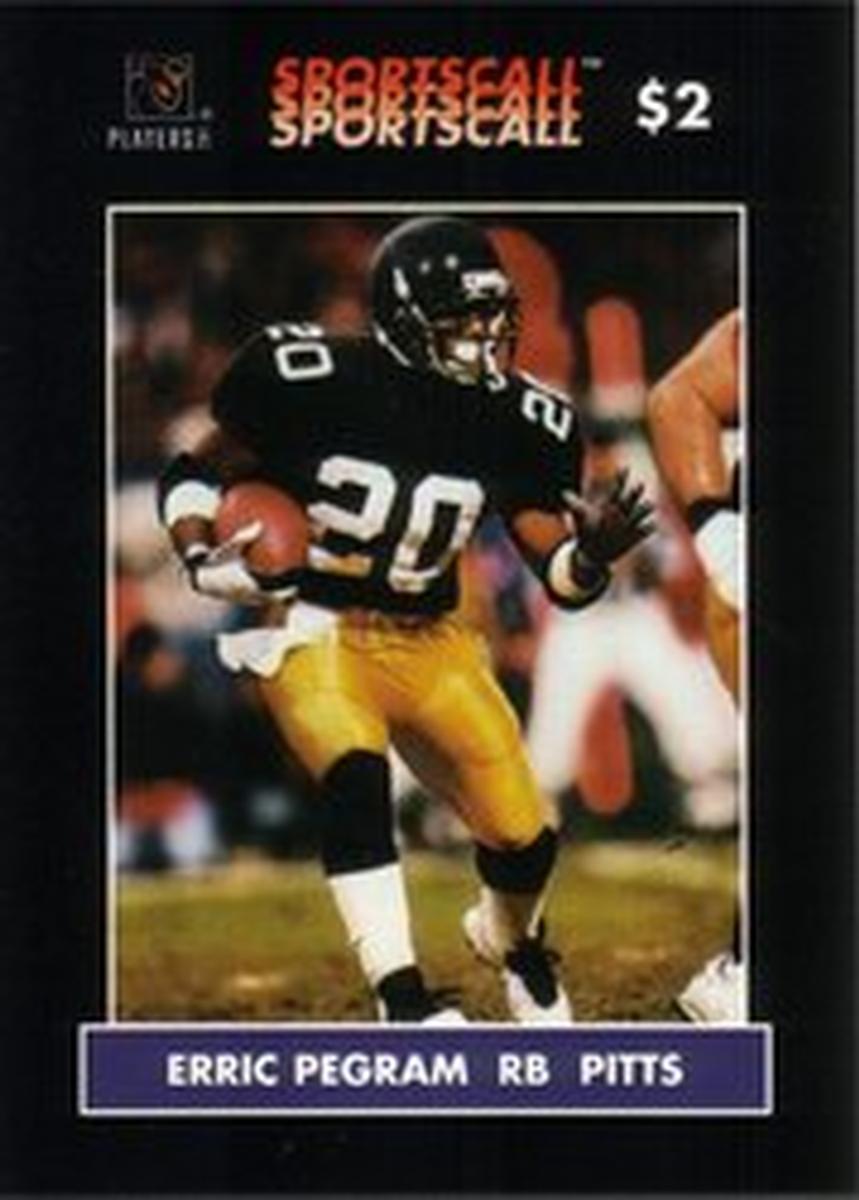 This collectible card features NFL running back Erric Pegram of the Pittsburgh Steelers. It displays a full-color photographic image of Pegram in his Steelers uniform, poised in a running stance with the football securely held in his right arm. The uniform includes the team's classic black and gold colors, and the helmet features the Pittsburgh Steelers logo. Pegram's face is visible through the helmet's facemask, highlighting his focused expression.